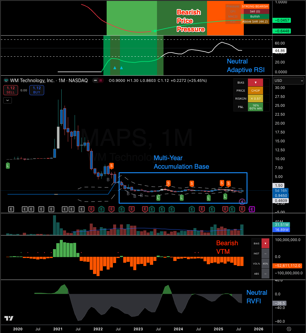 System analysis of WM Technology (MAPS) reveals a fundamentally robust asset operating under a condition of extreme market dislocation. The company functions as a near-monopoly in its niche with a highly defensible, asset-light SaaS model that generates 95%+ gross margins and has produced eight consecutive quarters of positive cash flow growth. Valuation is exceptionally compelling, with an EV/EBITDA multiple of 3.0x—a dramatic discount to its peers and historical averages. Further validation is provided by a 47.9% institutional ownership base that includes top-tier asset managers and a withdrawn $1.70 take-private offer that establishes a clear valuation floor well above the current price. Combined founder ownership of 21.6% signals strong insider alignment and conviction.