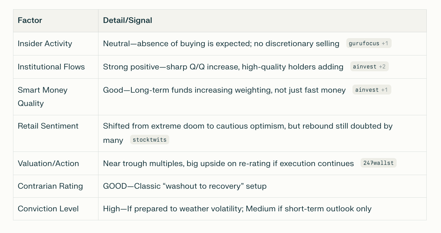 Conclusion: NIO shows a strong contrarian setup: institutional “smart money” buying after peak pessimism, improving business performance, and valuation support. The shift is not fully priced in—reward potential is high for risk-tolerant, patient investors.