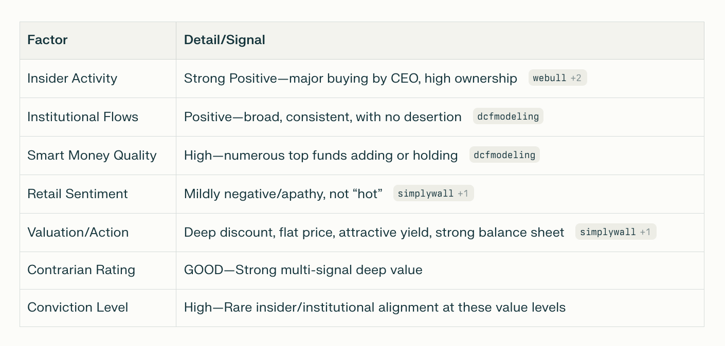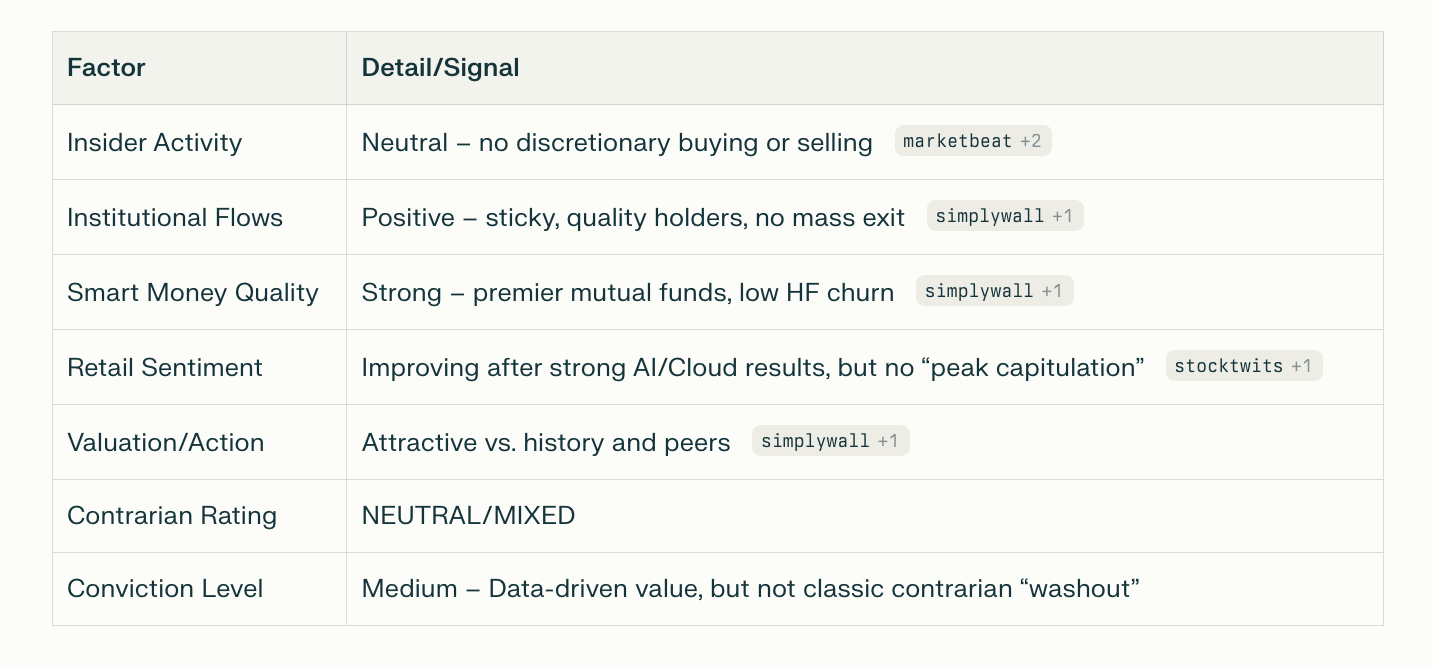 Conclusion: BIDU offers a compelling “smart value” setup for patient investors, with the rare combination of sector leadership, sticky quality ownership, balanced sentiment, and clear earnings momentum—but it lacks a classic “contrarian capitulation” dynamic at present.
