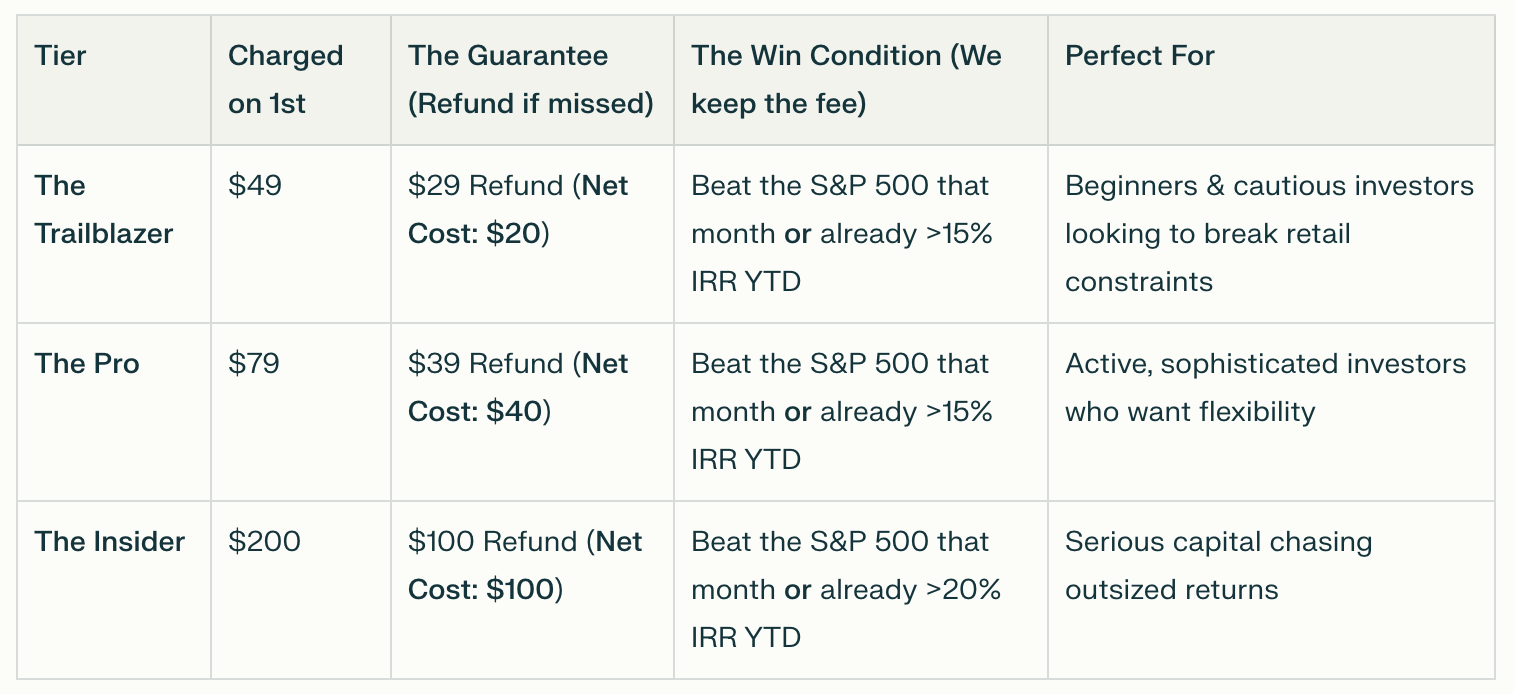 After delivering 85% IRR last year and strong double-digit gains already in 2025, we’re confident enough to put our fees directly on the line — starting today.