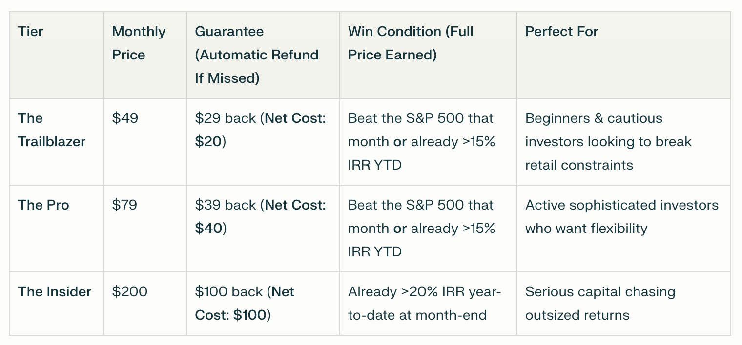 For Existing Members: Your current plan and pricing remain unchanged — enjoy the same full access at your locked-in rate indefinitely. Want the new Performance Pact (automatic partial refunds if we miss benchmarks)?