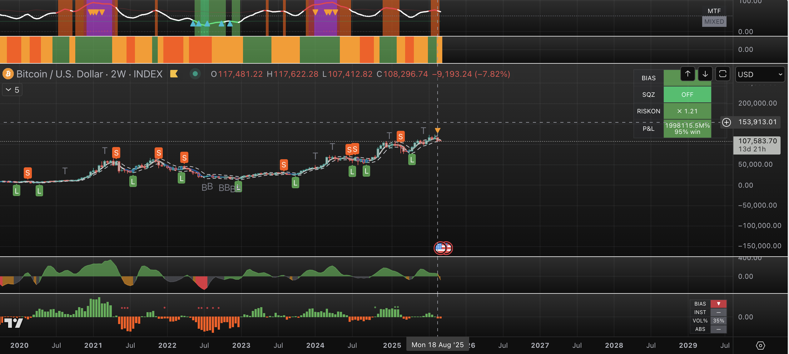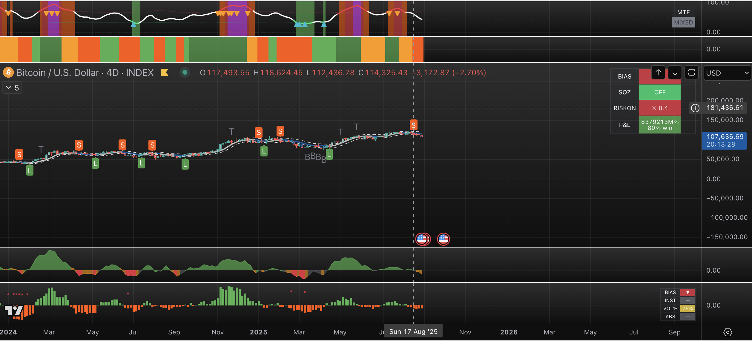 - BTC: The Consolidation Phase: The 4D sell signal on August 18th materialized successfully, calling the pullback from the $117k-$123k peaks. Our primary thesis (a 70% probability) is that the current $108k level marks a local bottom, representing the 80-day cycle low and initiating a 4-6 week consolidation. The probability of an absolute cycle top remains a tail-risk at ~30%, requiring confirmation from cascading sell signals on higher timeframes (1W/2W).