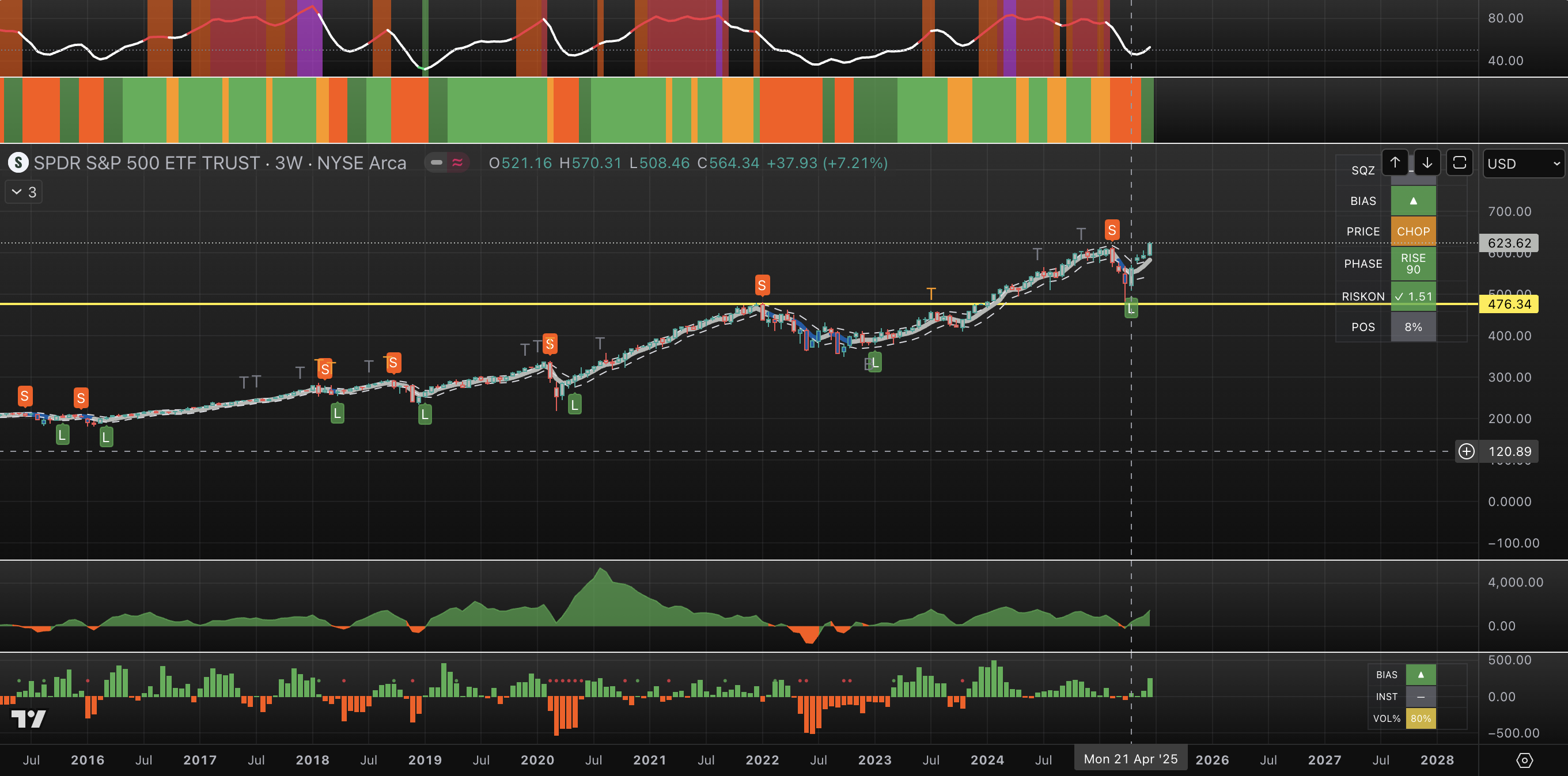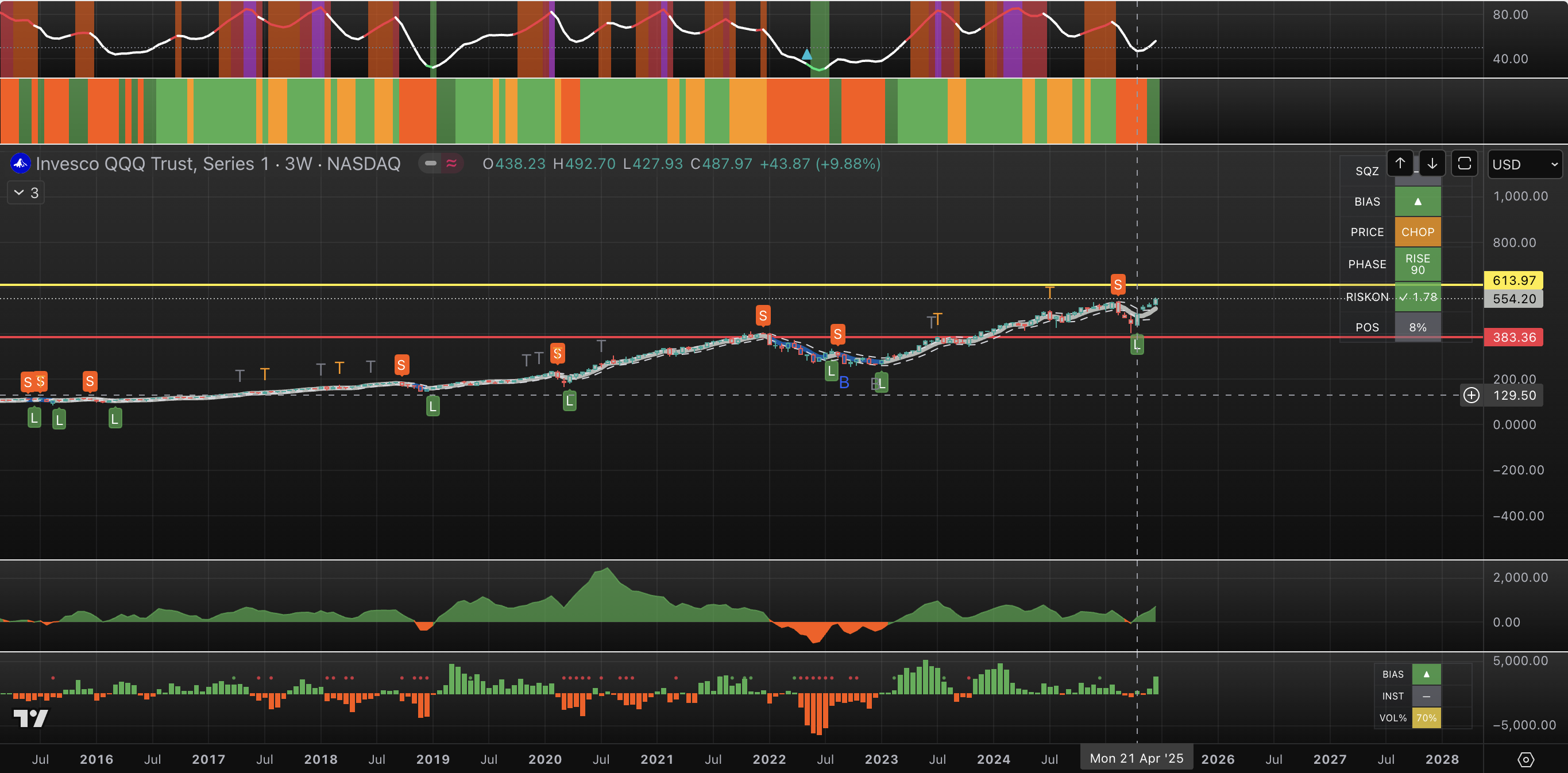 Our proprietary Duo-Lens system flagged both SPY and QQQ with the exact same pattern and a confirmed "Buy" signal during the mid-April corrective move. We focus on these ETFs because they provide superior volume data and offer more precise forecasts than their underlying indexes.