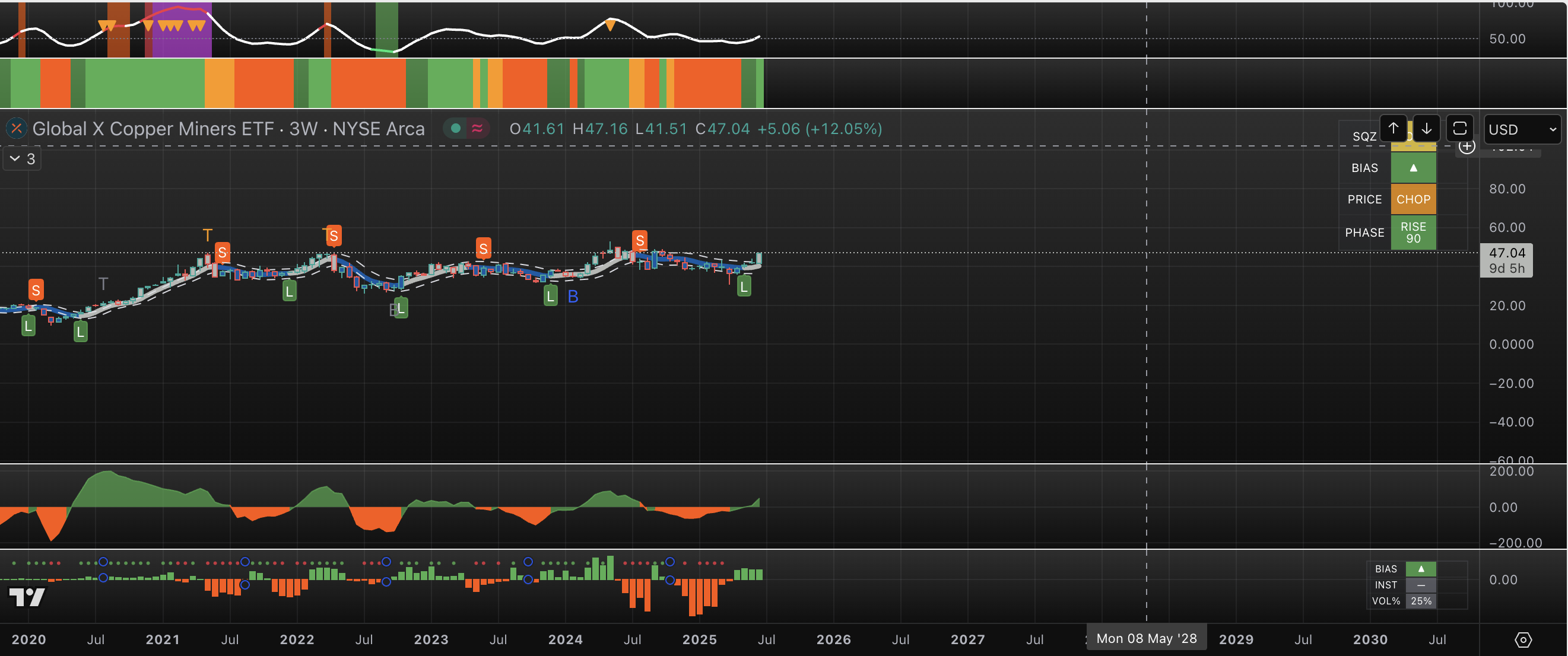 The chart for Copper Miners ETF (COPX) show a masterclass in market structure. Having completed a powerful, multi-year Phase 1 (Accumulation), both has decisively entered Phase 2 (Rise/Mark-Up) on strong, healthy volume. This is a broad, confirmed, sector-wide shift.