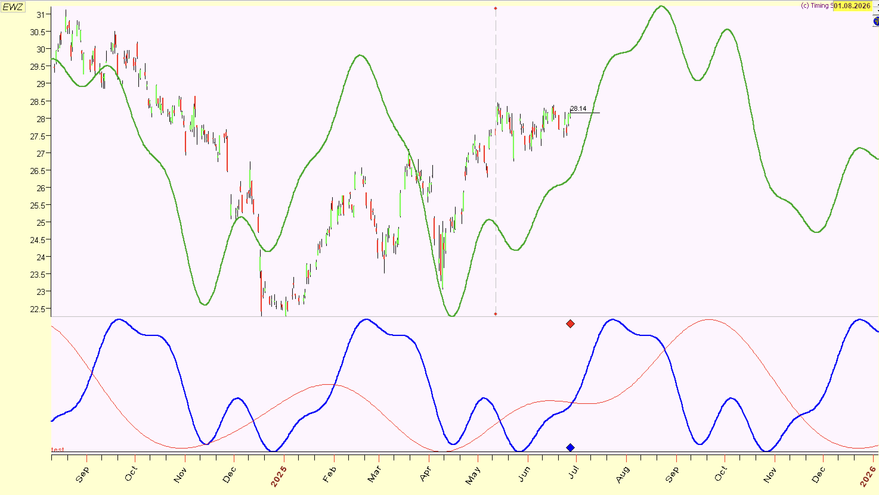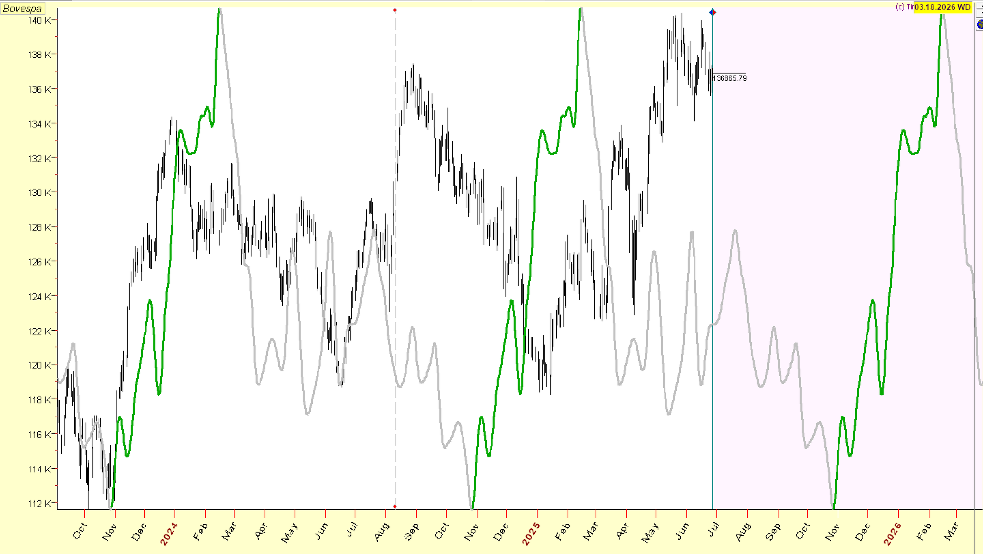 Unlike other equity markets, Brazilian index displays rather weak form of 3.5 year cycle with choppy price action; so it is unclear if it formed in December 2024 or is still ahead in 2026, similar to other markets. However, we have strong evidence that 18 month cycle low has formed and is rising further into summer. This is in sync with BRL cycles (Brazilian Real has near perfect correlation with Brazilian stock market).